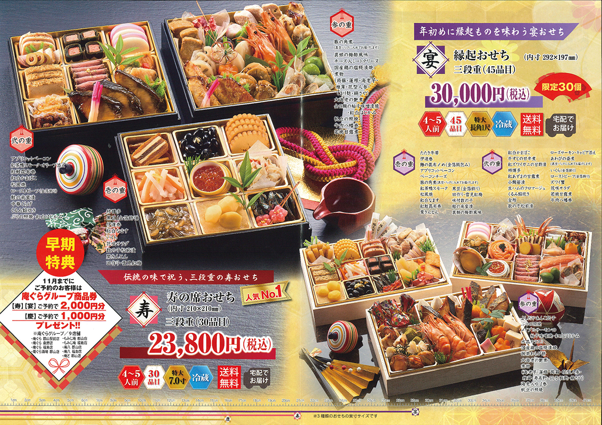 ※12月31日はおせち特集のお料理のみ注文を承ります。その他お弁当・オードブルは当日受け付けておりませんので、予めご了承いただけますと幸いです。